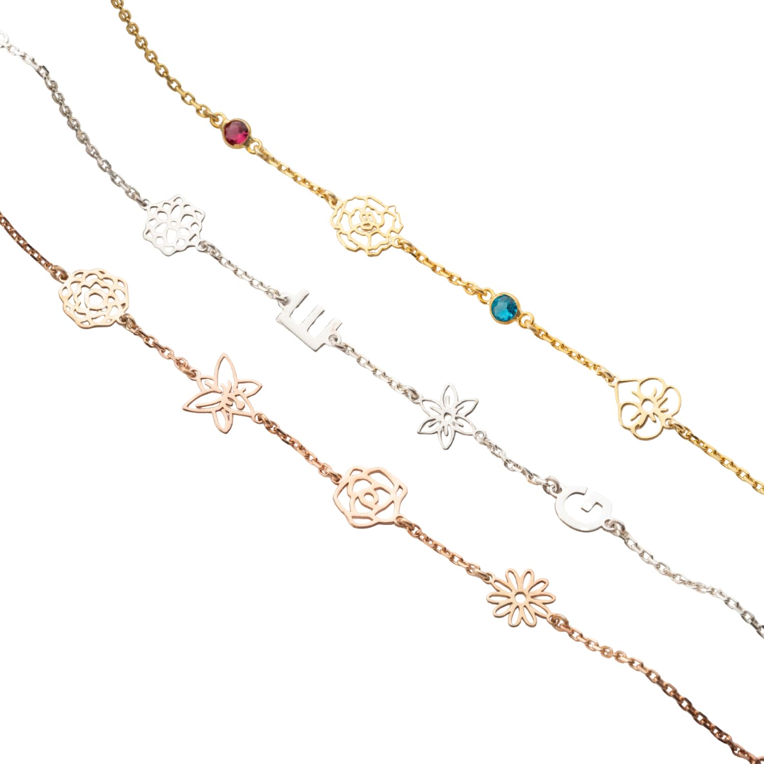Personalized Flower and Initial Bracelet with Birthstone for Women, 925 Sterling Silver